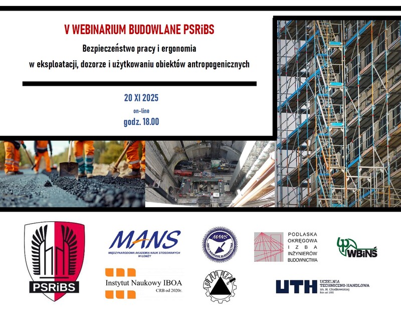 Zapraszamy na V Webinarium Budowlane PSRiBS pt. „Bezpieczeństwo pracy i ergonomia w eksploatacji, dozorze i użytkowaniu obiektów antropogenicznych”, które odbędzie się dnia 20 listopada 2025 r. o godz. 18.00 on-line.